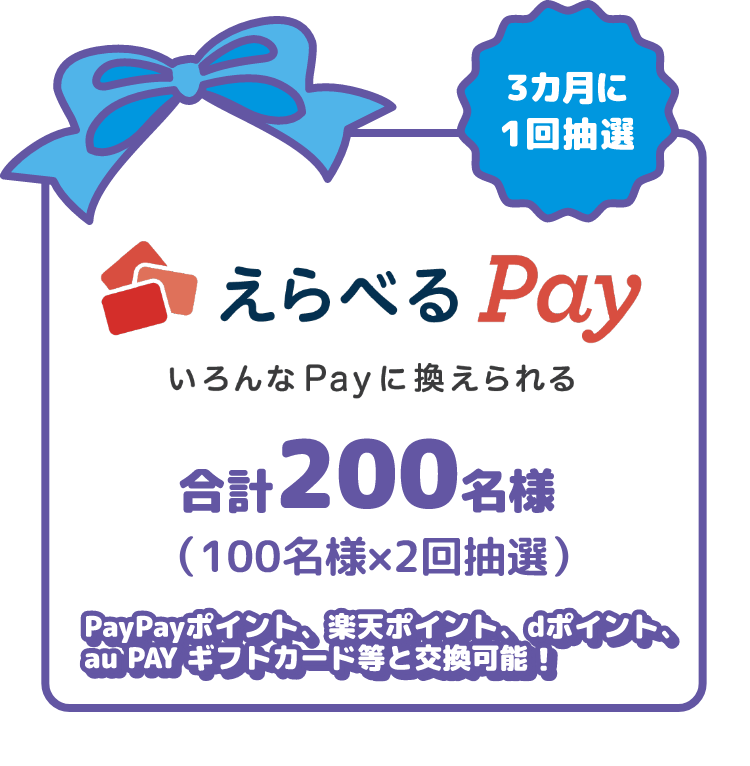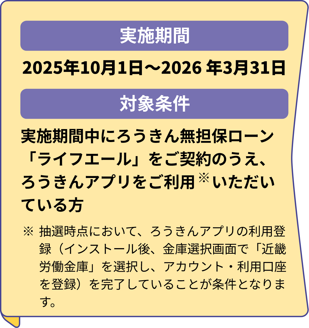 ●本キャンペーンは応募不要です。辞退を希望される場合は、営業店窓口へご相談ください。●対象条件を満たした日が2025年10月~2025年12月の場合は2026年1月、2026年1月~2026年3月の場合は2026年4月に抽選いたします。●実施期間中に複数のご契約をいただいている場合でも、お一人さま一口として抽選をいたします。●抽選月の前月末までに、ご完済いただいた場合は対象外となります。●厳正なる抽選のうえ、当選者へは抽選月下旬にろうきんアプリのプッシュ通知でお知らせいたしますので、受信設定をオン(許可)にしてお待ちください。●賞品は、抽選月下旬にろうきんアプリ内の賞品受取りバナーを通じて配信を予定しています。●ろうきんアプリのアンインストールやアカウント削除、メイン口座に登録の普通預金口座を解約された場合は対象外となることがあります。●ろうきんアプリの動作保証環境を満たす場合でも、端末の設定などにより正常に動作しない場合があります。個々の事象についてはご対応いたしかねます。●接続料・通信料はお客さまのご負担になります。●不正の可能性がある場合は、事務局の判断で当選無効にいたします。●賞品の第三者への譲渡や転売、換金等は禁止いたします。●賞品の返品・交換および再発行や再配信はいたしかねます。●本キャンペーン内容および賞品は予告なく変更する場合があります。●抽選内容に関するお問合せにはお答えいたしかねます。●えらべるPayは、ポイントやPay系の商品を自由に選べるギフトです。ポイント内であれば複数のギフトと自由に交換することができます。利用に際して専用のアプリのダウンロードや会員登録は必要ありません。選択された商品によって、1ポイントにつき1円相当とならない場合がございます。また、交換レートを含む商品の内容は今後予告なく変更する場合がございます。●キャンペーンの詳細は、当金庫ホームページまたは営業店窓口でご確認ください。●記載内容は、2025年10月1日現在のものです。