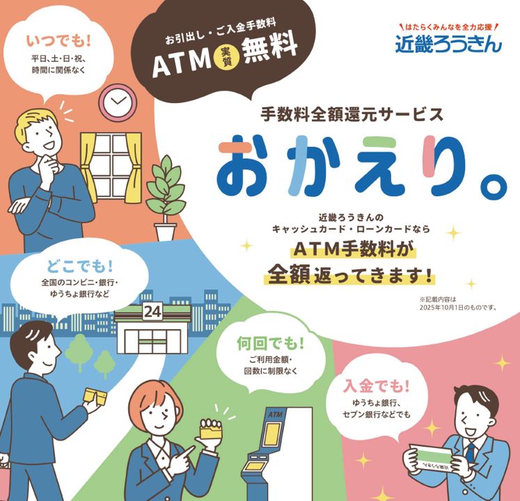 近畿ろうきんのキャッシュカードはもちろん、ローンカードのご利用でも、ATMお引出し手数料が実質無料です。